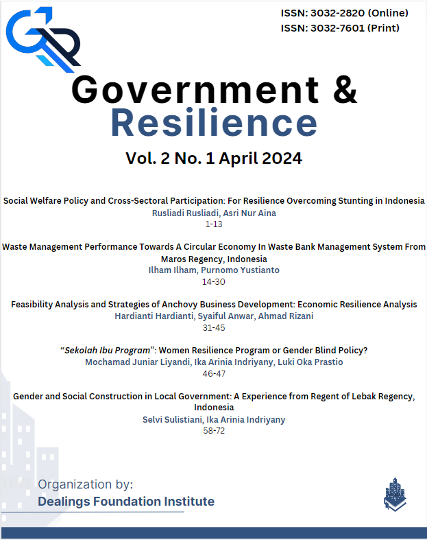 If the article was jointly prepared by more than one author, any author submitting the manuscript warrants that he or she has been authorized by all co-authors to agree on this copyright and license notice (agreement) on their behalf and agrees to inform his or her co-authors of the terms of this policy. Government & Resilience will not be held liable for anything that may arise due to the author's internal dispute. Government & Resilience will only communicate with the corresponding author.